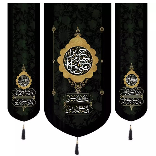به این صورت که کتیبه وسط منقش به نام حسین منی و انا من حسین علیه السلام(رنگ مشکی) در ابعاد 65×135 سانتی متر و در دو طرف منقش به نام های یا زینب الکبری سلام الله علیها و یا ابالفضل(رنگ مشکی) در ابعاد 35×130 سانتی متر می باشد.